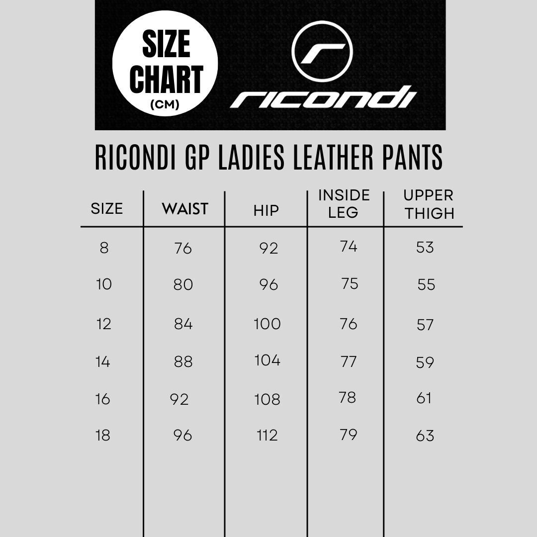 Incorporating Ricondi Racing Series GP suit technology. The LADY GP EVO SERIES have been designed with comfort and safety at front of mind and is a high spec pants ready for the rigours of the road or track. Made from the highest grade cowhide and Aramid fibre stretch panels, the EVO pants designed to withstand the tough conditions of motorcycling be it on the road or on the track while at the same time offering flexibility and comfort. Key features include: Ergonomically designed and cut for comfort in a road riding position. Key panels Triple Reinforced stitched with the third stitch hidden for protection Strategically placed re-inforced stretch panels. Upgraded CE EN1621-1 2012 body armour stitched and velcroed in place. Dual layer leather hide in the seat, of the pants Ricondi chosen "4TRACK" liner which is static free, moisture wicking and anti-bacterial INCLUDES KNEE SLIDERS Designed and tested in Australia, sold to the world