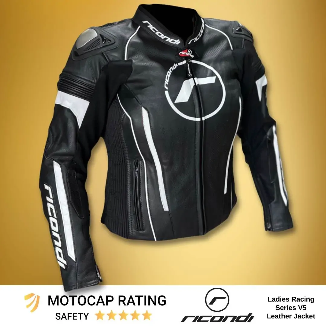 All NEW for 2024 is the Racing Series V5 Leather jacket from RICONDI. - Ladies Black/White edition. **ALPINESTARS TECH-AIR COMPATIBLE** Ask us about fitment. RICONDI AUSTRALIA is an authorised TECH-AIR DEALER and SERVICE CENTRE. Safety and protection features are innate in the DNA make up of this jacket. Made from the highest grade cowhide the RACING SERIES jacket is designed to withstand the rigours of the open roads and track, while at the same time offers flexibility and comfort enabling the rider to move fast and freely over the motorcycle. See photos for sizing chart. Key features include: ALPINESTARS TECH-AIR COMPATIBLE Upgraded design with greater "pre-curve". Ergonomically designed and cut for comfort in a race riding position Upgraded neoprene collar for added fit and comfort Leather stretch panels around the rib cage for added comfort and fit Multi Row Triple Stitching is used for superior strength Strategically placed reinforced ARAMID FIBRE stretch panels. Ti shoulder, elbow and knee slider protection. Upgraded CE approved body armour. Upgraded liner, which is static free, moisture wicking and features anti-bacterial materials. Zip out thermal liner for the cooler days Perforated leather on the front panels Mix and match with a pair of Ricondi GP Evo Leather Pants to be track compliant.