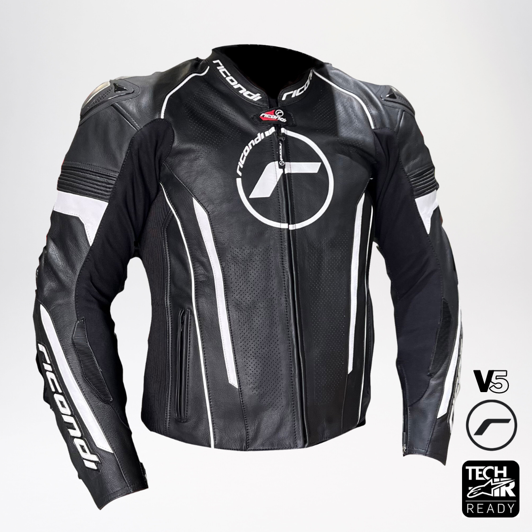 All NEW for 2024 is the Racing Series V5 Leather jacket from RICONDI. - Black/White edition. **ALPINESTARS TECH-AIR COMPATIBLE** Ask us about fitment. RICONDI AUSTRALIA is an authorised TECH-AIR DEALER and SERVICE CENTRE. Safety and protection features are innate in the DNA make up of this jacket. Made from the highest grade cowhide the RACING SERIES jacket is designed to withstand the rigours of the open roads and track days, while at the same time offers flexibility and comfort enabling the rider to move fast and freely over the motorcycle. See photos for sizing chart. Key features include: ALPINESTARS TECH-AIR COMPATIBLE Upgraded design with greater "pre-curve". Ergonomically designed and cut for comfort in a race riding position Upgraded neoprene collar for added fit and comfort Leather stretch panels around the rib cage for added comfort and fit Multi Row Triple Stitching is used for superior strength Strategically placed reinforced ARAMID FIBRE stretch panels. Ti shoulder, elbow and knee slider protection. Upgraded CE approved body armour. Upgraded liner, which is static free, moisture wicking and features anti-bacterial materials. Zip out thermal liner for the cooler days Perforated leather on the front panels Mix and match with a pair of Ricondi GP Evo Leather Pants to be track compliant.